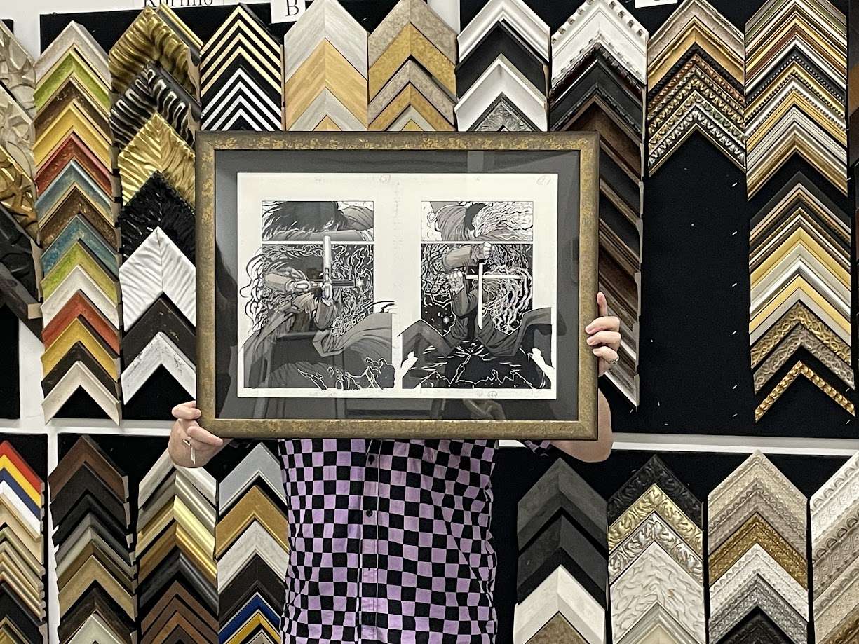 原画 額装 2025/06/10 漫画の原画の額装のご注文をいただきました いつもありがとうございます!! 漫画の原画作品を額装させていただきました。 繊細かつ迫力あるモノクロの原画に合わせて、深みのある黒のマットと、落ち着いた輝きを持つ渋めのゴールドフレームを選定。 主張しすぎず、それでいて作品の持つ緊張感と世界観を引き立てるフレーミングを意識しています。原画ならではの細やかな筆致や質感を損なうことなく、美術品としての存在感を高める額装となりました。 漫画原画やイラスト、アート作品などの額装をご検討の方は、ぜひお気軽にご相談ください。