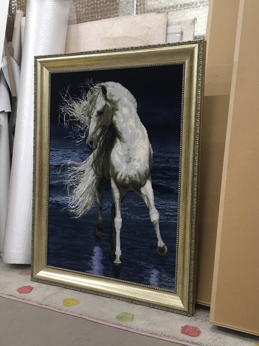 躍動感のある白馬のペルシャ絨毯の額装が仕上がりました。