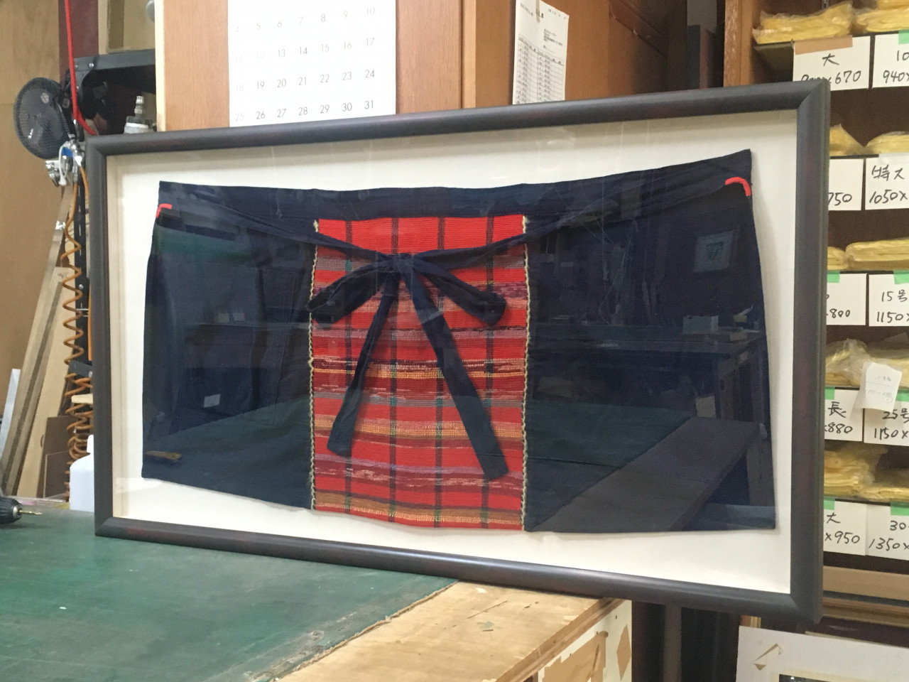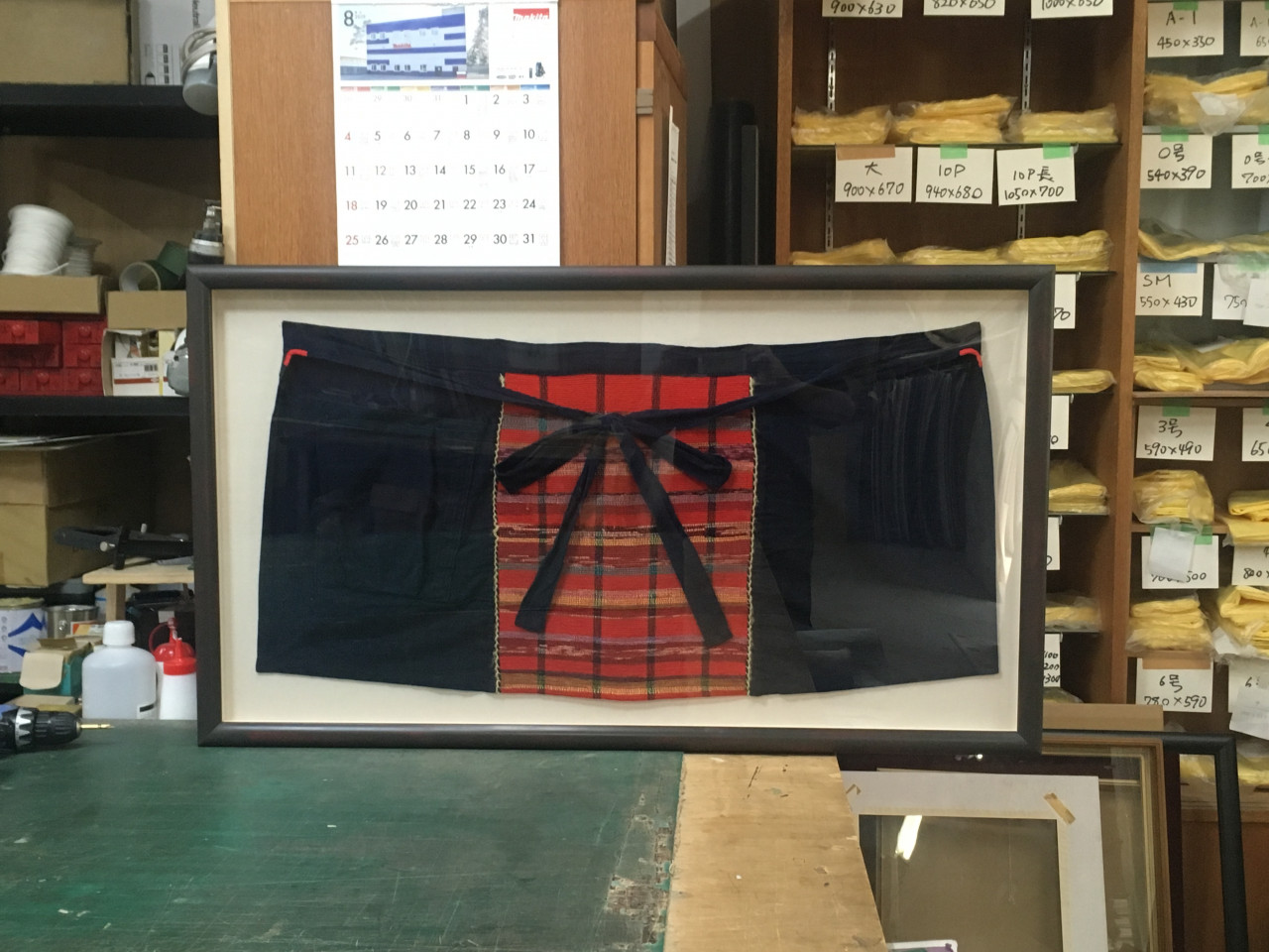 お客様よりご注文いただいておりましたエプロンの額装が仕上がりました。