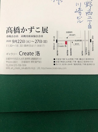 髙橋かずこ展のお知らせ 2020/09/01 髙橋かずこ展 展示会のお知らせ 額装でお世話になっております髙橋かずこさんの展示会が開催されますので下記の通りお知らせいたします。 髙橋かずこ展 ギャラリーCreate洛 〒604-0801 京都府京都市中京区丸太町通堺町鍵屋町69 TEL/FAX 075-708-7898 2020年9月22日(火)~27日(日) 11:30~18:30(最終日は17:00まで) 皆さま是非とも足をお運びくださいませ。