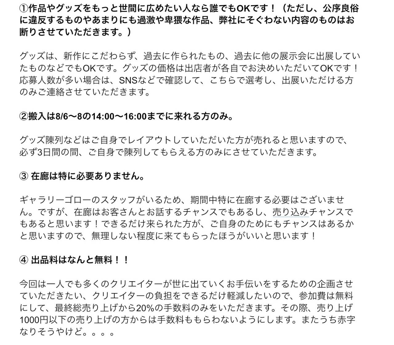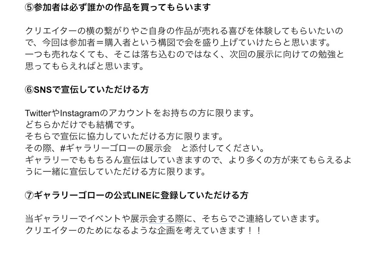 ご自身以外の作家さんの作品を一点以上買わなければいけないことと、搬入期間3日間あるうちのいずれかに必ず来て、ご自身でセッティングしていただける方、終了後、作品と売上金を引き取りに来ていただけることだけ。