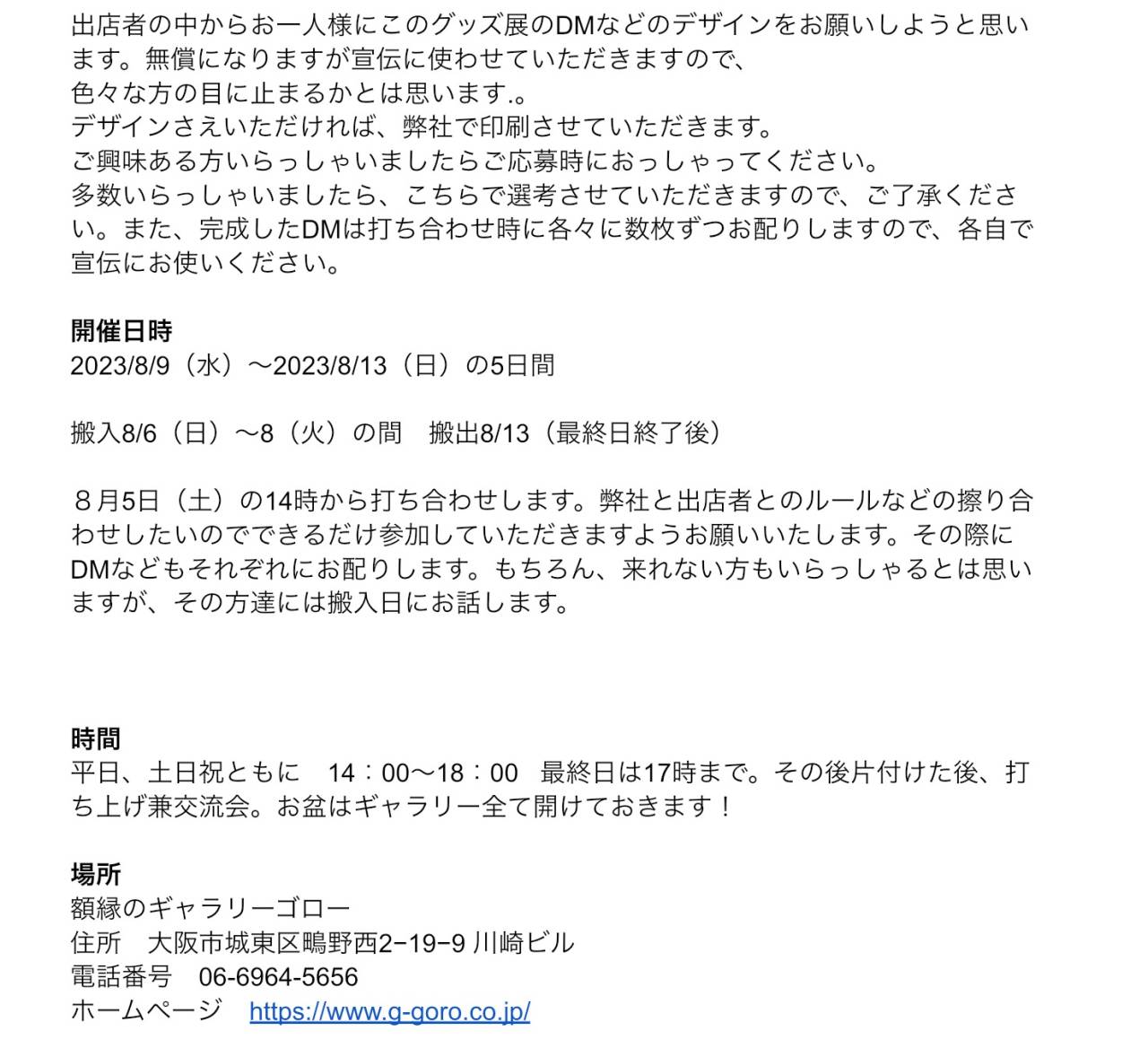 8月5日(土)の14時から打ち合わせします。弊社と出店者とのルールなどの擦り合わせしたいのでできるだけ参加していただきますようお願いいたします。その際にDMなどもそれぞれにお配りします。もちろん、来れない方もいらっしゃるとは思いますが、その方達には搬入日にお話します。