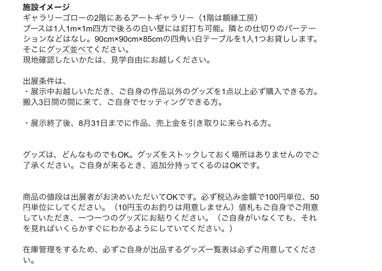 ・展示中お越しいただき、ご自身の作品以外のグッズを1点以上必ず購入できる方。搬入3日間の間に来て、ご自身でセッティングできる方。