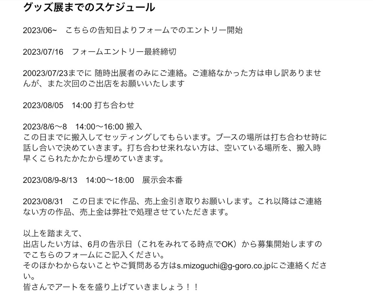 20023/07/23までに 随時出展者のみにご連絡。ご連絡なかった方は申し訳ありませんが、また次回のご出店をお願いいたします
