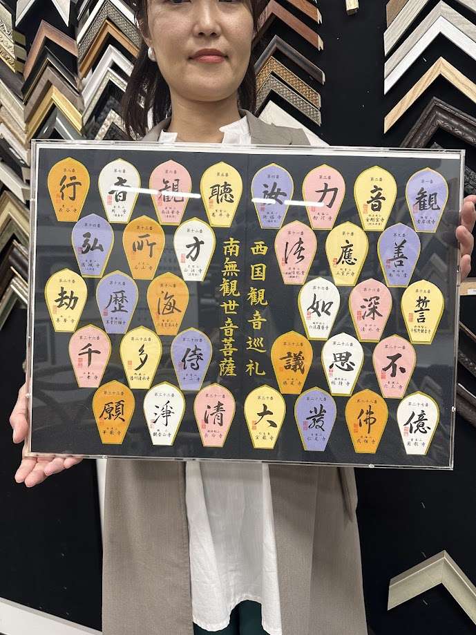 額装 完成 2024/06/14 額装の受け取りのご紹介 西国観音巡礼の西国三十三所散花の額装のご注文を頂きました。 お父様との思いでのお品とのことで、その場でお電話にてお話されていたのが印象的でした。 私たちもとても嬉しくおもいます。 アクリルボックスの額装ですので、中身の透明度が高く、 横から見ても美しいです。 今回はご用命ありがとうございました。 また飾られた感想などもおうかがいできると嬉しいです。 弊社ではアクリルボックスの額装も、どのようなサイズでも対応しております。 いつでもご相談お待ちしております。 今回はありがとうございました。