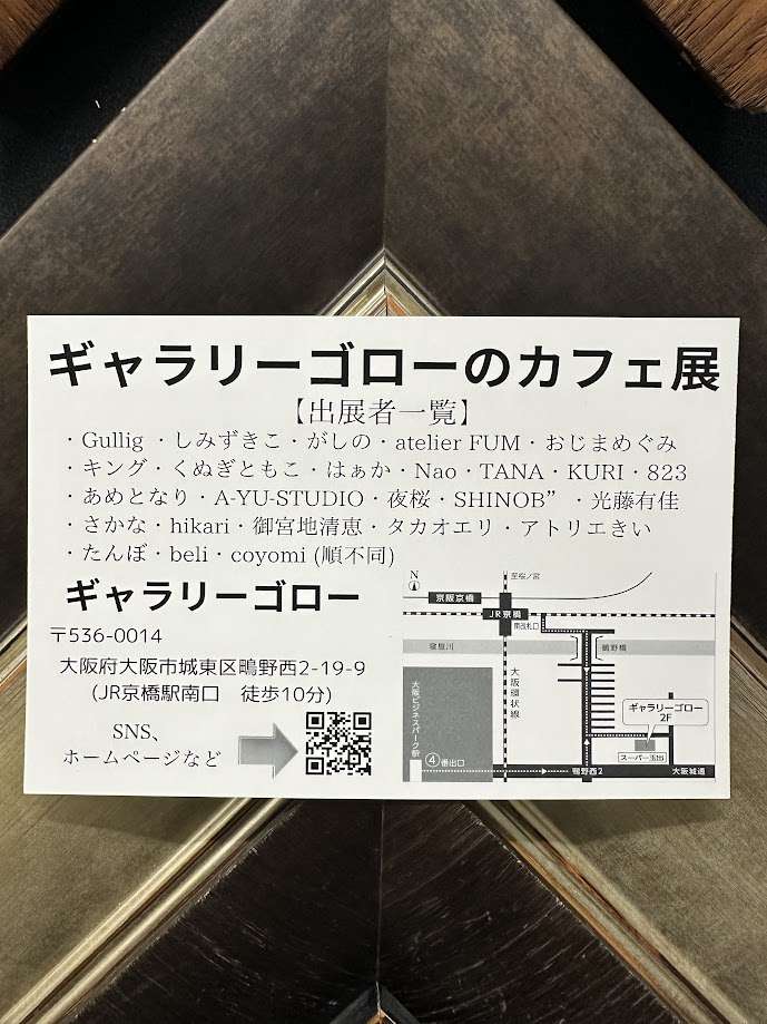 カフェ展 展示会 2024/06/17 カフェ展 開催します 本日より弊社ギャラリーにて開催いたします。 本日より弊社ギャラリーにてカフェ展を開催致します。 ギャラリーゴローのカフェ展 6/17(月)~6/23(日) 14:00~18:00(最終日17:00) 総勢25名の作家による約40点のカフェをテーマにした作品を展示しております。 アンケートで上位の作品は近くのカフェで会期終了後展示します。 様々な作品を展示しておりますので、皆様のお越しをお待ちしております。